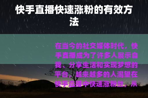 在当今的社交媒体时代,快手直播成为了许多人展示自我、分享生活和实现梦想的平台,越来越多的人渴望在快手直播中快速涨粉丝,从而扩大自己的影响力,以下是一些能够帮助你在快手直播中快速涨粉的实用方法。