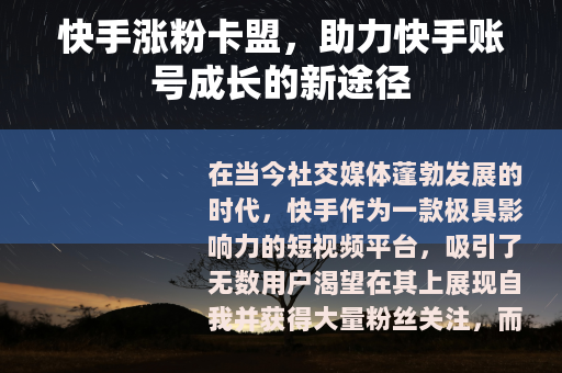 在当今社交媒体蓬勃发展的时代,快手作为一款极具影响力的短视频平台,吸引了无数用户渴望在其上展现自我并获得大量粉丝关注,而快手涨粉卡盟的出现,为许多有此需求的用户提供了一种可能的解决方案。