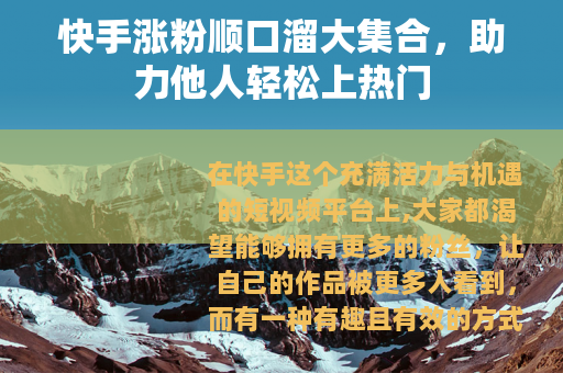 通过这些快手帮别人涨粉的顺口溜,我们可以更好地理解和运用一些涨粉的技巧和方法,无论是对于自己的快手账号,还是帮助身边的朋友在快手上获得更多的关注,都有着积极的作用,希望大家都能在快手这个大舞台上,凭借着这些有趣的顺口溜和自己的努力,收获满满的粉丝,让自己的快手之旅更加精彩。