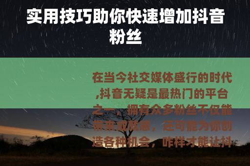 在当今社交媒体盛行的时代,抖音无疑是最热门的平台之一,拥有众多粉丝不仅能带来成就感,还可能为你创造各种机会,咋样才能让抖音粉丝多呢?以下是一些行之有效的方法。