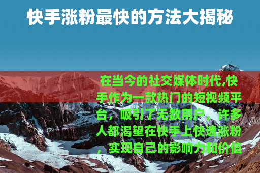在当今的社交媒体时代,快手作为一款热门的短视频平台,吸引了无数用户,许多人都渴望在快手上快速涨粉,实现自己的影响力和价值,快手怎么样涨粉最快呢?下面就为大家详细介绍一些有效的方法。 是涨粉的关键,要确保你的视频具有独特性、趣味性和实用性,可以从自己的兴趣爱好、专业技能或生活中的点滴入手,制作出能够引起观众共鸣的内容,如果你擅长烹饪,那么可以制作一系列精美的美食制作视频,详细展示每一个步骤和技巧,让观众在观看的过程中不仅能够学到知识,还能感受到美食的魅力。