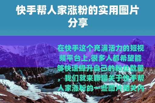 在快手这个充满活力的短视频平台上,很多人都希望能够快速提升自己的粉丝数量,我们就来聊聊关于快手帮人家涨粉的一些图片相关内容。