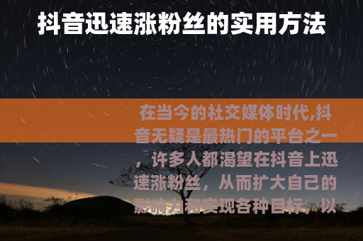 在抖音上迅速涨粉丝需要多方面的努力和策略,通过持续提供优质内容、提升制作技巧、保持稳定更新、利用热门话题以及积极互动等方法,你就有更大的机会在抖音这个大舞台上吸引到众多粉丝,实现自己的抖音梦想。