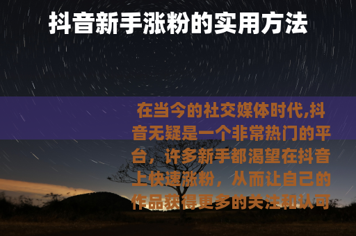 在当今的社交媒体时代,抖音无疑是一个非常热门的平台,许多新手都渴望在抖音上快速涨粉,从而让自己的作品获得更多的关注和认可,以下是一些抖音新手涨粉的有效方法。