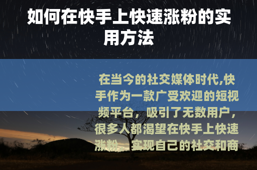 在当今的社交媒体时代,快手作为一款广受欢迎的短视频平台,吸引了无数用户,很多人都渴望在快手上快速涨粉,实现自己的社交和商业价值,以下是一些切实可行的方法,帮助你在快手上快速积累粉丝。