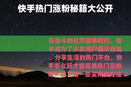 在当今的社交媒体时代,快手成为了众多用户展示自我、分享生活的热门平台,快手怎么玩才能容易热门涨粉呢?以下是一些实用的方法。