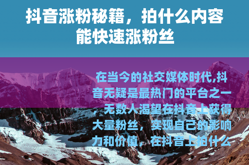 在当今的社交媒体时代,抖音无疑是最热门的平台之一,无数人渴望在抖音上获得大量粉丝,实现自己的影响力和价值,在抖音上拍什么内容涨粉丝最快呢?