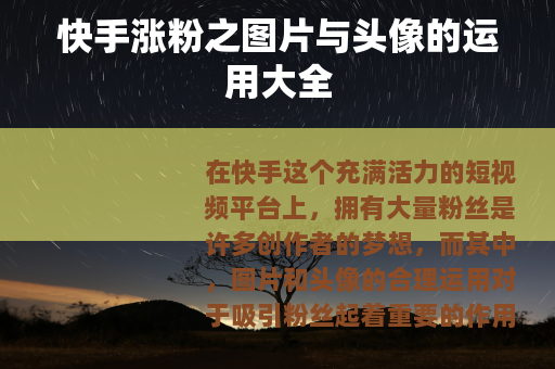 在快手这个充满活力的短视频平台上,拥有大量粉丝是许多创作者的梦想,而其中,图片和头像的合理运用对于吸引粉丝起着重要的作用,我们就来为大家分享一些关于快手涨粉的图片大全以及头像的选择技巧。