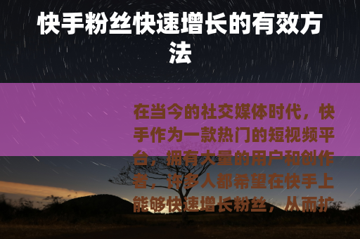 在当今的社交媒体时代,快手作为一款热门的短视频平台,拥有大量的用户和创作者,许多人都希望在快手上能够快速增长粉丝,从而扩大自己的影响力和获得更多的机会,怎样才能让快手的粉丝涨得快呢?以下是一些实用的方法。
