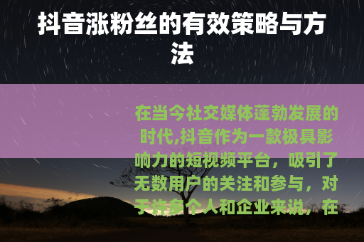 在当今社交媒体蓬勃发展的时代,抖音作为一款极具影响力的短视频平台,吸引了无数用户的关注和参与,对于许多个人和企业来说,在抖音上拥有大量粉丝成为了追求的目标之一,因为这不仅可以带来更多的曝光和流量,还可能为个人或品牌创造更多的商业机会,如何在抖音上有效地涨粉丝呢?以下是一些实用的策略和方法。