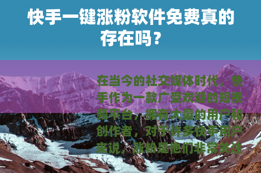 在当今的社交媒体时代,快手作为一款广受欢迎的短视频平台,拥有大量的用户和创作者,对于许多快手用户来说,涨粉是他们非常关注的一个问题,关于快手一键涨粉软件免费的话题也备受瞩目。