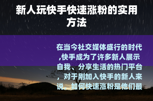 在当今社交媒体盛行的时代,快手成为了许多新人展示自我、分享生活的热门平台,对于刚加入快手的新人来说,如何快速涨粉是他们最为关心的问题之一,以下是一些切实可行的方法,能帮助新人在快手上吸引更多的关注,实现粉丝量的增长。