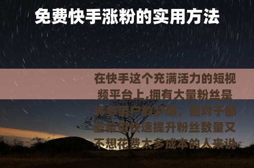 通过以上这些方法的综合运用,就能够在不花费任何费用的情况下,逐步提升自己在快手上的粉丝数量,实现自己的短视频创作目标,在快手这个大舞台上获得更多的关注和认可。