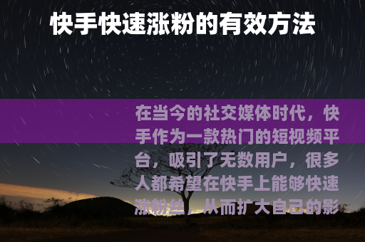 在当今的社交媒体时代,快手作为一款热门的短视频平台,吸引了无数用户,很多人都希望在快手上能够快速涨粉丝,从而扩大自己的影响力和社交圈,以下是一些可以帮助你在快手快速涨粉的方法。
