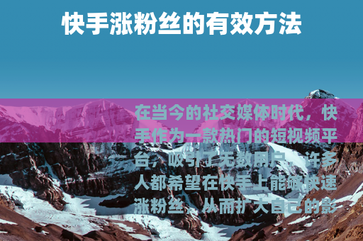 在当今的社交媒体时代,快手作为一款热门的短视频平台,吸引了无数用户,许多人都希望在快手上能够快速涨粉丝,从而扩大自己的影响力和社交圈,以下是一些关于快手涨粉丝的实用方法。