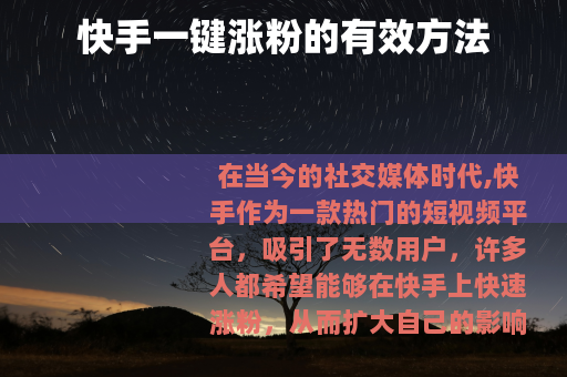 在当今的社交媒体时代,快手作为一款热门的短视频平台,吸引了无数用户,许多人都希望能够在快手上快速涨粉,从而扩大自己的影响力和获得更多的机会,以下是一些关于快手一键涨粉的实用方法。