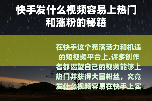 在快手这个充满活力和机遇的短视频平台上,许多创作者都渴望自己的视频能够上热门并获得大量粉丝,究竟发什么视频容易在快手上实现这些目标呢?