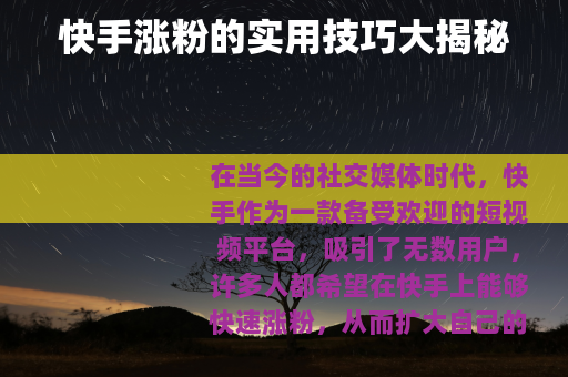 想要在快手上涨粉并不是一件难事,只要你掌握了这些实用的技巧,并不断地努力和创新,相信你一定能够在快手上收获大量的粉丝,实现自己的目标。