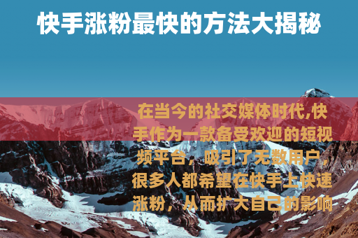 在当今的社交媒体时代,快手作为一款备受欢迎的短视频平台,吸引了无数用户,很多人都希望在快手上快速涨粉,从而扩大自己的影响力,那么快手怎么涨粉丝最快呢?以下是一些实用的方法。 是关键,要确保你的视频具有独特性、趣味性和实用性,你可以分享自己的才艺,如唱歌、跳舞、绘画等,用精彩的表演吸引观众的目光,或者制作一些生活小妙招、美食制作教程等实用型视频,让用户觉得能从你的视频中学到东西,只有当你的内容足够吸引人,用户才会愿意关注你,成为你的粉丝。