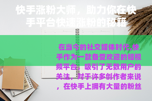 在当今的社交媒体时代,快手作为一款备受欢迎的短视频平台,吸引了无数用户的关注,对于许多创作者来说,在快手上拥有大量的粉丝是他们追求的目标之一,而这也催生了所谓的“快手涨粉大师”。