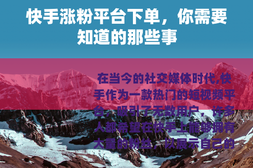 在当今的社交媒体时代,快手作为一款热门的短视频平台,吸引了无数用户,许多人都希望在快手上能够拥有大量的粉丝,以展示自己的才华、产品或服务,从而获得更多的关注和机会,快手涨粉平台下单这一服务也应运而生。