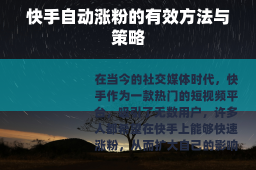 在当今的社交媒体时代,快手作为一款热门的短视频平台,吸引了无数用户,许多人都希望在快手上能够快速涨粉,从而扩大自己的影响力和获得更多的机会,以下是一些关于快手自动涨粉的实用方法和策略。