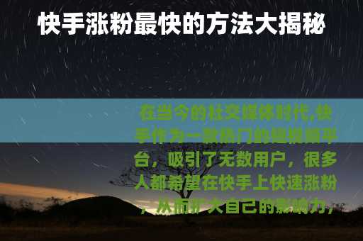 想要在快手上快速涨粉,需要从多个方面入手,不断努力和创新,提供优质的内容,保持稳定的更新,充分利用平台的功能,积极与其他创作者合作,并且注重视频的细节设计,才能在竞争激烈的快手平台上吸引到更多的粉丝,实现自己的目标。