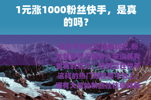 在当今的社交媒体时代,粉丝数量对于很多人来说具有重要的意义,特别是在快手这样的热门短视频平台上,拥有大量的粉丝往往意味着更多的关注、更高的影响力以及可能带来的各种商业机会,不少人都在寻找快速增加粉丝的方法,而“1元涨1000粉丝快手”这样的宣传口号也应运而生,吸引了众多人的目光。