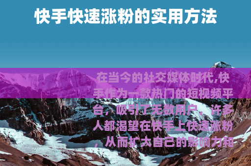 在当今的社交媒体时代,快手作为一款热门的短视频平台,吸引了无数用户,许多人都渴望在快手上快速涨粉,从而扩大自己的影响力和社交圈,以下是一些能够帮助你在快手实现快速涨粉的有效方法。 是关键,你需要确定自己的定位和擅长的领域,比如美食、时尚、健身、搞笑等,然后持续输出有价值、有特色且高质量的视频内容,如果你擅长烹饪,那么可以制作详细的美食制作教程,从食材准备到烹饪过程,再到最后的成品展示,都要清晰明了,让观众能够从中学习到有用的知识或获得视觉上的享受,在内容创作上要注重创新,不断尝试新的拍摄手法、剪辑方式和创意主题,这样才能吸引更多用户的关注。