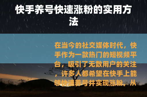 在当今的社交媒体时代,快手作为一款热门的短视频平台,吸引了无数用户的关注,许多人都希望在快手上能够快速养号并实现涨粉,从而让自己的作品获得更多的曝光和认可,以下是一些快手养号快速涨粉的有效方法。