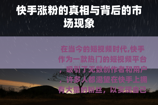 在当今的短视频时代,快手作为一款热门的短视频平台,吸引了无数创作者和用户,许多人都渴望在快手上拥有大量的粉丝,以实现自己的创作价值和商业目标,而在这个过程中,市场上出现了一种所谓“快手涨粉一元1000”的现象,引发了广泛的关注和讨论。