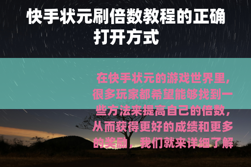 在快手状元的游戏世界里,很多玩家都希望能够找到一些方法来提高自己的倍数,从而获得更好的成绩和更多的奖励,我们就来详细了解一下快手状元刷倍数的教程,帮助大家在合法合规的前提下,更好地享受游戏的乐趣。