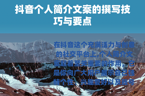 一个好的抖音个人简介文案能够为你的账号增色不少,帮助你在抖音的海洋中吸引更多的关注和喜爱,让你在这个充满机遇的平台上更好地展现自己,实现自己的价值。