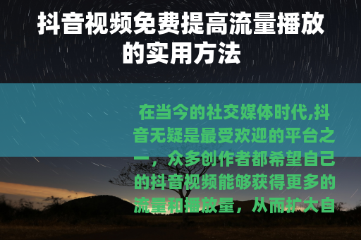 在当今的社交媒体时代,抖音无疑是最受欢迎的平台之一,众多创作者都希望自己的抖音视频能够获得更多的流量和播放量,从而扩大自己的影响力和知名度,以下是一些可以免费提高抖音视频流量播放的有效方法。