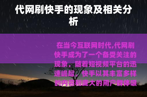 在当今互联网时代,代网刷快手成为了一个备受关注的现象,随着短视频平台的迅速崛起,快手以其丰富多样的内容和庞大的用户群体吸引了无数人的目光,而在这个过程中,代网刷快手的业务也应运而生。