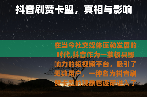 在当今社交媒体蓬勃发展的时代,抖音作为一款极具影响力的短视频平台,吸引了无数用户,一种名为抖音刷赞卡盟的现象也逐渐进入了大众的视野。