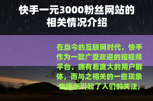 在当今的互联网时代,快手作为一款广受欢迎的短视频平台,拥有着庞大的用户群体,而与之相关的一些现象也逐渐引起了人们的关注,其中就包括所谓的快手一元3000粉丝网站。