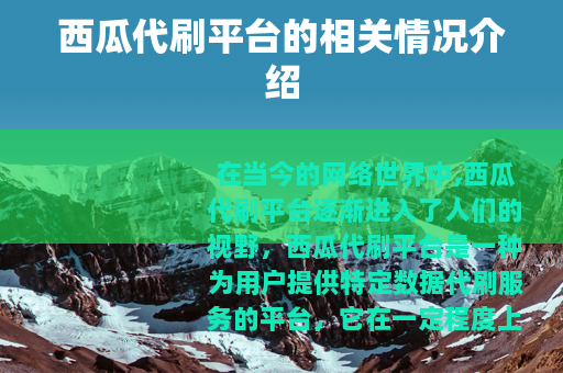在当今的网络世界中,西瓜代刷平台逐渐进入了人们的视野,西瓜代刷平台是一种为用户提供特定数据代刷服务的平台,它在一定程度上满足了部分用户对于数据增长的需求。