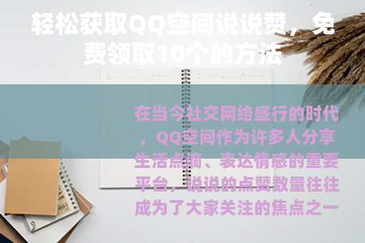 在当今社交网络盛行的时代,QQ空间作为许多人分享生活点滴、表达情感的重要平台,说说的点赞数量往往成为了大家关注的焦点之一,谁不想自己精心发布的说说能获得更多人的认可和喜爱呢?就来给大家介绍一种免费领取10个QQ空间说说赞的方法。