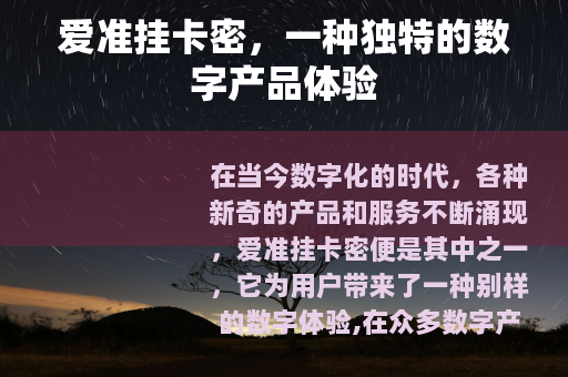 在当今数字化的时代,各种新奇的产品和服务不断涌现,爱准挂卡密便是其中之一,它为用户带来了一种别样的数字体验,在众多数字产品中占据着独特的位置。