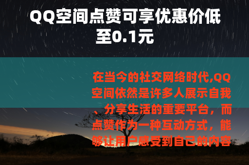 我们在享受这种低价点赞服务带来的便利和好处的同时,也要保持理性和适度,不要过度依赖点赞数量来衡量自己在社交网络中的价值,毕竟真正有意义的社交互动是建立在真诚和有价值的交流基础之上的,但不可否认的是,QQ空间点赞便宜至0.1元的现象,确实为我们的社交生活带来了新的可能性和乐趣,让我们在虚拟的社交世界中能够更加轻松地表达自己、展示自己,与更多的人产生连接和共鸣,它为我们提供了一种新的方式,去丰富和拓展我们的社交体验,让我们的QQ空间之旅更加精彩和难忘。