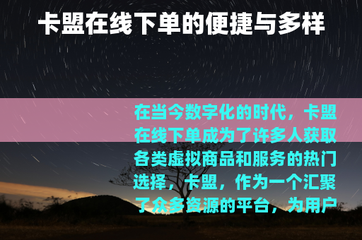 在当今数字化的时代,卡盟在线下单成为了许多人获取各类虚拟商品和服务的热门选择,卡盟,作为一个汇聚了众多资源的平台,为用户提供了丰富多样的下单选项,满足了不同需求群体的各种要求。