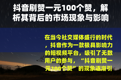 在当今社交媒体盛行的时代,抖音作为一款极具影响力的短视频平台,吸引了无数用户的参与。“抖音刷赞一元100个赞”的现象逐渐引起了人们的关注。