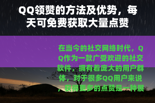 QQ领赞为我们提供了一个在社交网络中展示自己、提升自己的好机会,通过每天免费领赞,我们可以让自己的QQ生活更加丰富多彩,结交更多的朋友,收获更多的快乐和满足感,让我们充分利用这个机会,在QQ的世界里展现出最自信、最独特的自己,享受社交带来的无限魅力,无论是在名片展示还是说说分享中,都能通过领赞让自己的每一个瞬间都闪耀光芒,让更多的人看到我们的精彩,共同营造一个充满活力和温暖的QQ社交圈子。