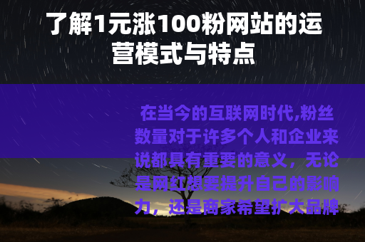在当今的互联网时代,粉丝数量对于许多个人和企业来说都具有重要的意义,无论是网红想要提升自己的影响力,还是商家希望扩大品牌的知名度,拥有大量的粉丝往往是实现目标的关键之一,而在众多的涨粉途径中,1元涨100粉的网站引起了不少人的关注。