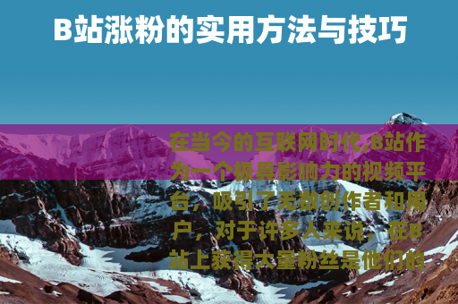 在当今的互联网时代,B站作为一个极具影响力的视频平台,吸引了无数创作者和用户,对于许多人来说,在B站上获得大量粉丝是他们的目标之一,如何在B站实现涨粉呢?以下是一些有效的方法和技巧。 质量是关键,要制作出高质量、有吸引力的视频内容,这意味着你需要有独特的创意和视角,能够提供给观众有价值的信息或娱乐体验,无论是搞笑、知识科普、美食制作还是游戏攻略等各种类型的视频,都要确保其内容充实、有趣且制作精良,在策划视频内容时,要深入了解你的目标受众的兴趣和需求,这样才能更好地吸引他们的关注并留住他们。