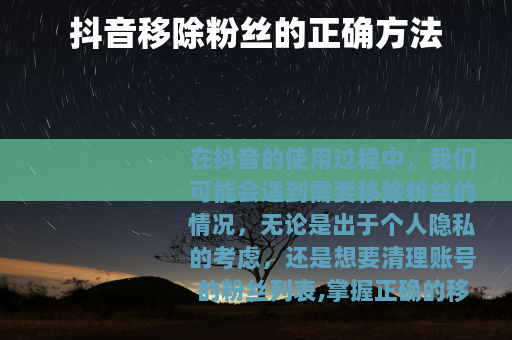 在抖音的使用过程中,我们可能会遇到需要移除粉丝的情况,无论是出于个人隐私的考虑,还是想要清理账号的粉丝列表,掌握正确的移除粉丝方法是很重要的。