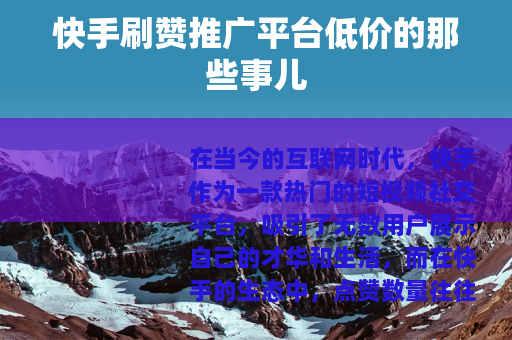 在当今的互联网时代,快手作为一款热门的短视频社交平台,吸引了无数用户展示自己的才华和生活,而在快手的生态中,点赞数量往往被视为衡量一个作品受欢迎程度的重要指标之一,快手刷赞推广平台低价便应运而生,成为了一些用户关注的焦点。