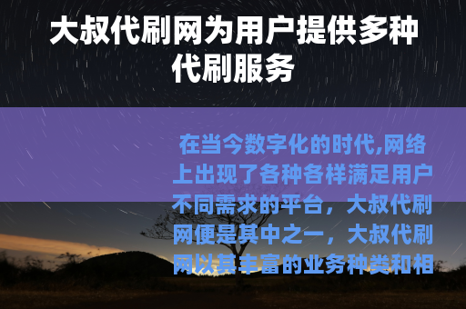 在当今数字化的时代,网络上出现了各种各样满足用户不同需求的平台,大叔代刷网便是其中之一,大叔代刷网以其丰富的业务种类和相对便捷的服务流程,吸引了不少用户的关注。