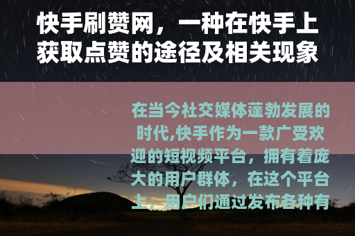 在当今社交媒体蓬勃发展的时代,快手作为一款广受欢迎的短视频平台,拥有着庞大的用户群体,在这个平台上,用户们通过发布各种有趣、有价值的视频来吸引关注和点赞,以获得更多的流量和曝光度,而快手刷赞网也随之应运而生,成为了一些用户试图提升自己作品热度的一种选择。